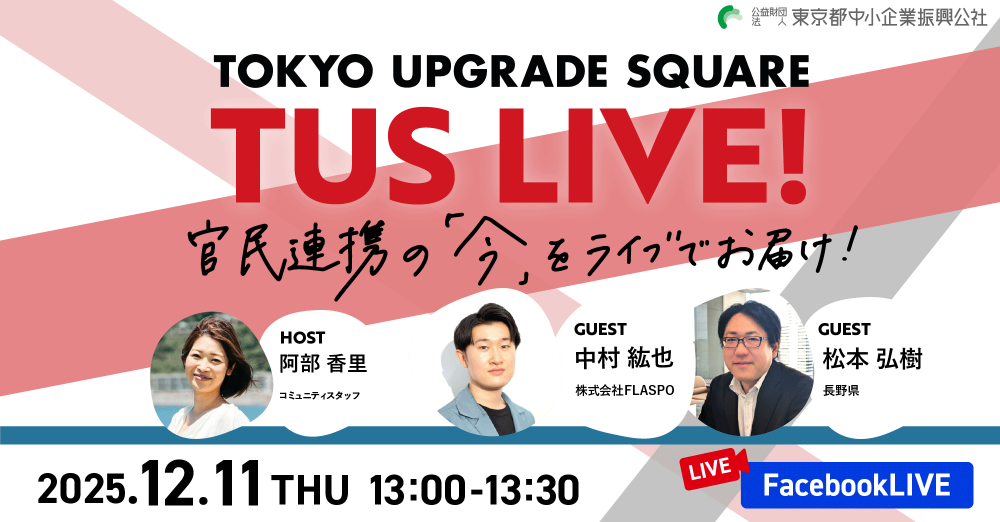 | 主催 | TOKYO UPGRADE SQUARE 東京都は行政課題をスピーディーに解決するため、スタートアップの斬新なアイデアやプロダクトを積極活用するフィールドの構築を進めています。「TOKYO UPGRADE SQUARE」は、都内の行政機関が恒常的に課題を発信し、その課題を解決できるスタートアップとの連携を多様な側面から支援する拠点です。 公式Facebookページ 公式YouTube |