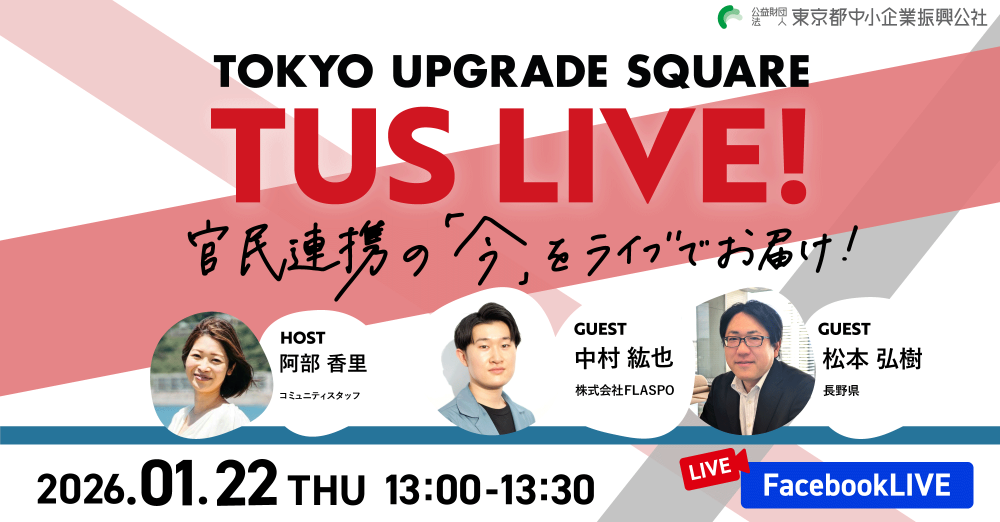 TOKYO UPGRADE SQUAREのイベント情報、スタートアップや行政へのインタビューなどを通して、官民連携の"今"をカジュアルにお届けします。事業成長・拡大にあたり行政との連携を検討しているスタートアップのみなさん、行政課題解決のためにスタートアップと連携したい行政機関の方など、TUSに興味をお持ちの方はぜひご覧ください!